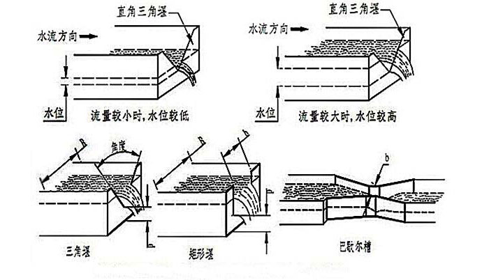 如上圖常用量水槽:直接三角堰、矩形堰、巴歇爾槽